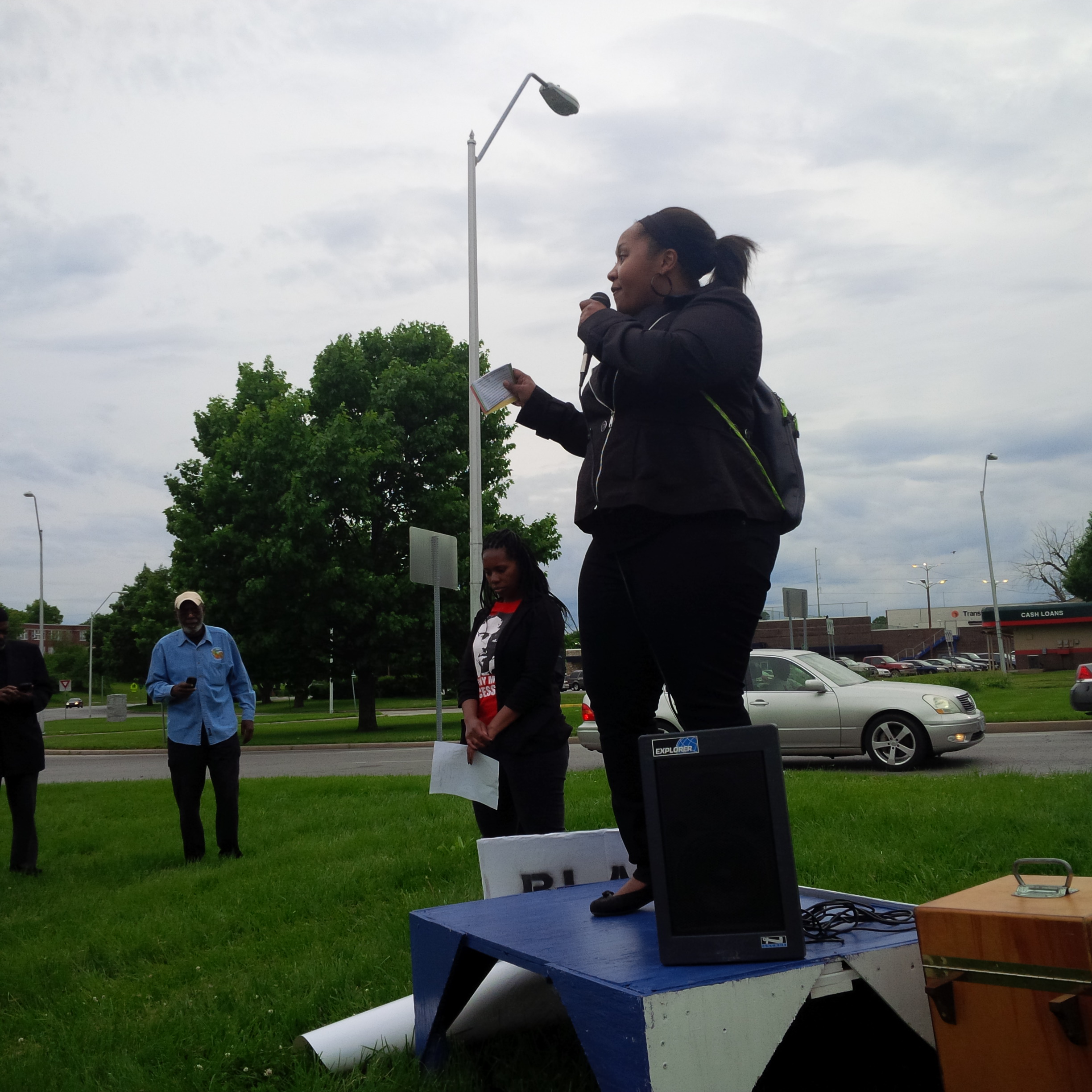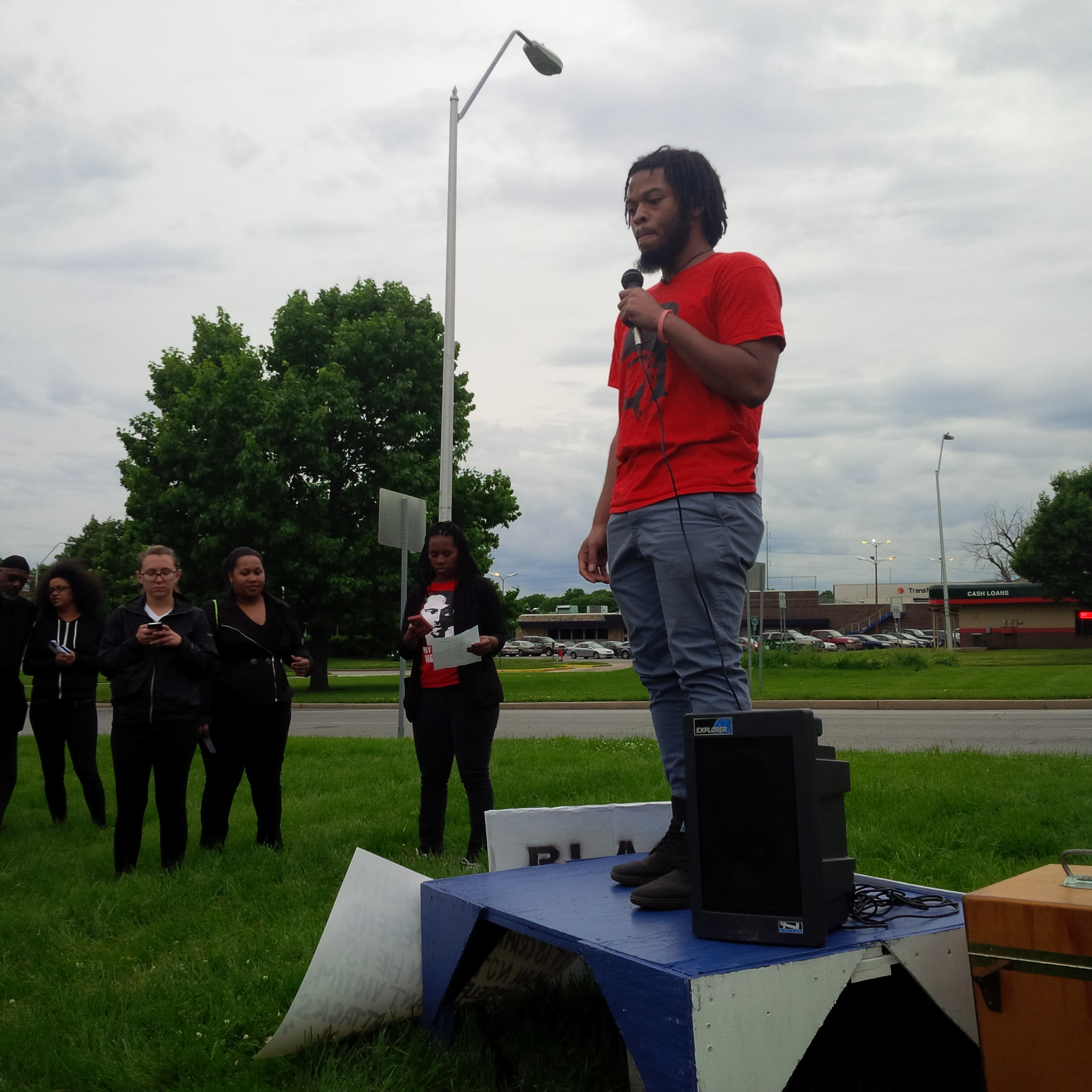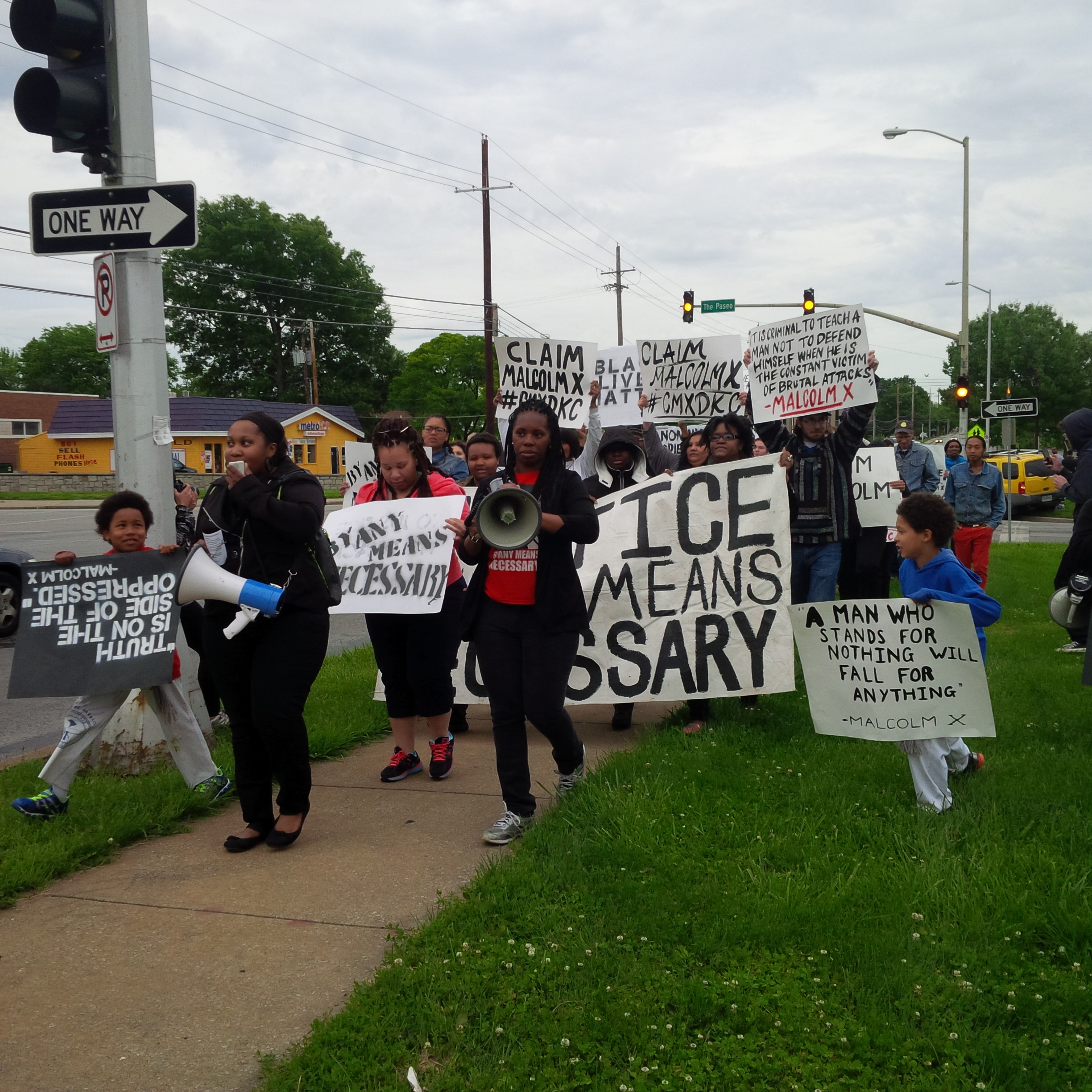 LUMPENPROLETARIAT—On Tuesday, 19 MAY 2015, Kansas City reprazented for Claim Malcolm X Day Worldwide. Lumpenproletariat.org was reporting live from this important civic gathering, occurring simulatenously across the USA. At 18:00 CDT, local community members peacefully assembled at 63rd and Paseo in Kansas City, Missouri for a rally to Claim Malcolm X Day. Several speakers delivered impassioned and moving speeches and spoken word. Representatives of Black Lives Matter as well as Chicana/Hispanic groups, such as Una Lucha were on hand. Local poet and UMKC undergrad student, Corey, delivered a beautiful and moving tribute to the spirit of revolutionary struggle represented by brother Malcolm X. The rally was followed by a march westbound on 63rd. (Photos and transcript pending.) The marchers chanted: