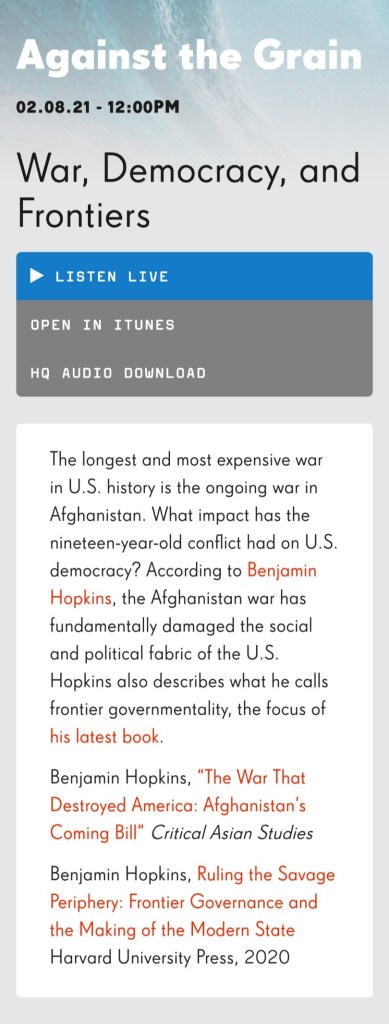 17:00 PST, KPFA > Flashpoints with Dennis Bernstein > 17:01 PST, ‘Death squads under Biden(?)’ “Kevin Pina” on Haiti […] ‘attempted coup on Friday’ […] ‘On Sunday’ […] ‘interim government’ […] ‘dictator’ has taken the place of the former dictator Duvalies(sp?)’ […] 17:07 PST, Dennis Bernstein: ‘Basically, the unwelcome president in Haiti tried to pull a Trump, but the courts said no. Now he is in hiding.’ […] Kevin Pina: ‘The people think he’s a U.S.-backed dictator.’ […] ‘bad phone line’ […] 17:09 PST, ‘Actually,’ says the senator from Wisconsin, ‘this impeachment is designed to distract us from Pelosi, who is really responsible for the take-over of the Capitol Building on January 6th.’ […] 17:10 PST, music break “On the Double” by DJ Crush.[…] 17:11 PST, Robert Craig, CitizenAction. ‘Tell us about your theory. Do you have any new information?’ […] 17:12 PST, guest avoids a direct answer, ‘he just gloms on to every…’ […] 17:14 PST, Dennis asked, if we should be impeaching right now, with the pandemic and all, evidently echoing the dominant ‘liberal‘, New-York-Times-type of concerns. To the guest’s credit, he acknowledged we must deal with both issues. […] cf. ‘I wrote a recent article for In These Times.’ ‘Progressives must unify him to back him up to a Biden version of FDR’s New Deal. But we also have the problem of needing all 50 Democratic votes.’ ‘And I don’t think we have Man-chen(sp?)’ […] 17:20 PST, 1726 ‘Now, we have to do our job, as progressives, and push Biden as far as we can, in the first 100 days.’ […] Up NEXT, HARRY WASSERMAN > […] 17:40 PST, call-ins, cf. George Lakoff book, The Political Mind. E.g.,the right-wing use of fear has been very effective.