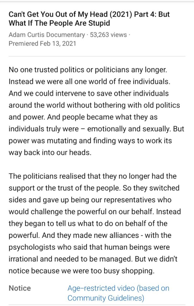 “Can’t Get You Out of My Head (2021) Part 4: But What If The People Are Stupid” by Adam Curtis Documentary, 13 FEB 2021.