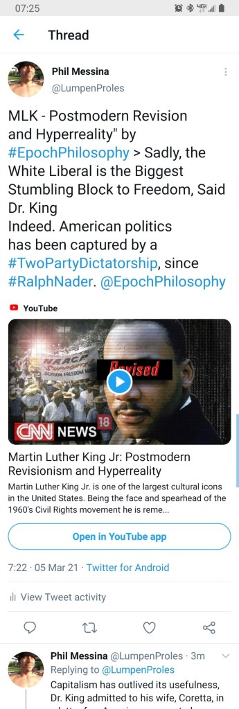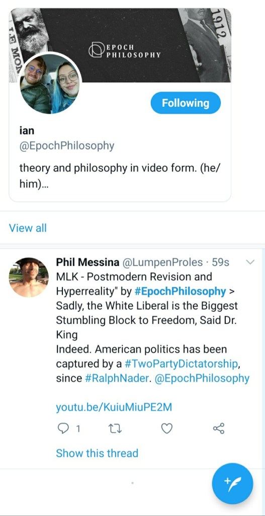 White scholars and others are also holding up our ancestors in the struggle for freedom. We’ve been vibin’ lately on this one YouTube channel called Epoch Philosophy, which is hosted by a white bloke from Canada, it seems. We just watched a video this morning, “Martin Luther King Jr – Postmodern Revisionism and Hyperreality“, by Epoch Philosophy, which expanded our view of Dr. King by acknowledging that Dr. King is one of our greatest leaders in U.S. history. Yet, the deep state assassinated Dr. King.