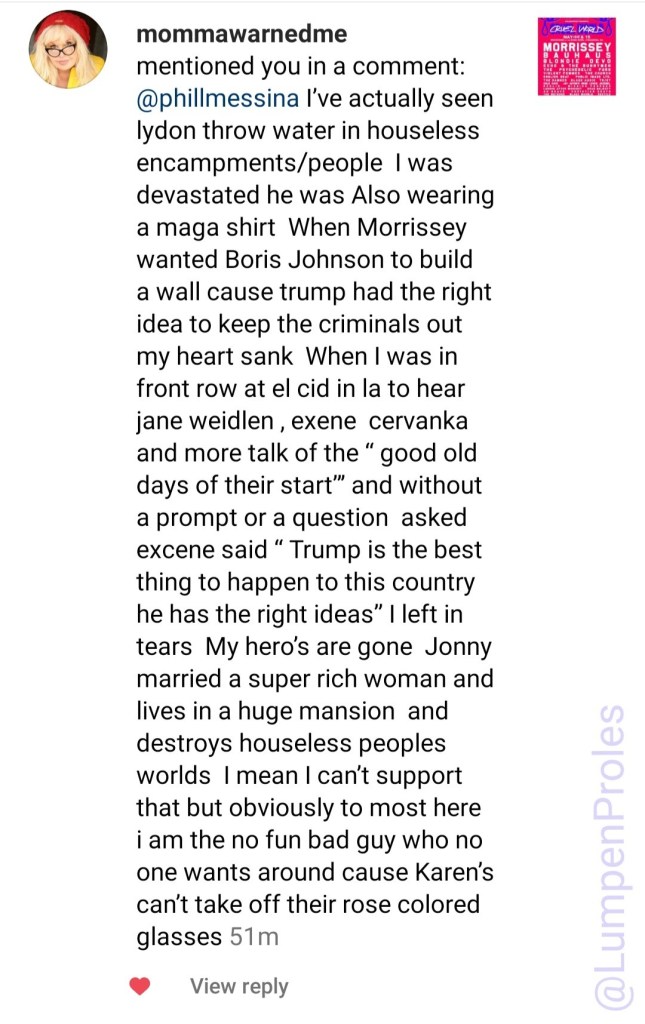 The Cruel World Fest on May 14th and 15th at Brookside at The Rose Bowl in Pasadena next month is one music festival your author may have attended, in previous decades. The two main draws for me would have been Public Image, Ltd. and Morrissey, not to mention other ’80s legends. But the 2020s is a decade of dystopia. Morrissey will headline the Cruel World music festival. Your author has attended many Morrissey concerts and supported Morrisey as an artist and cultural icon since the mid-1980s. Unfortunately, Morrissey came out as a fascist during the white supremacist Trump Years, even sporting far-right and proto-fascist pins on his lapel on American and British TV.