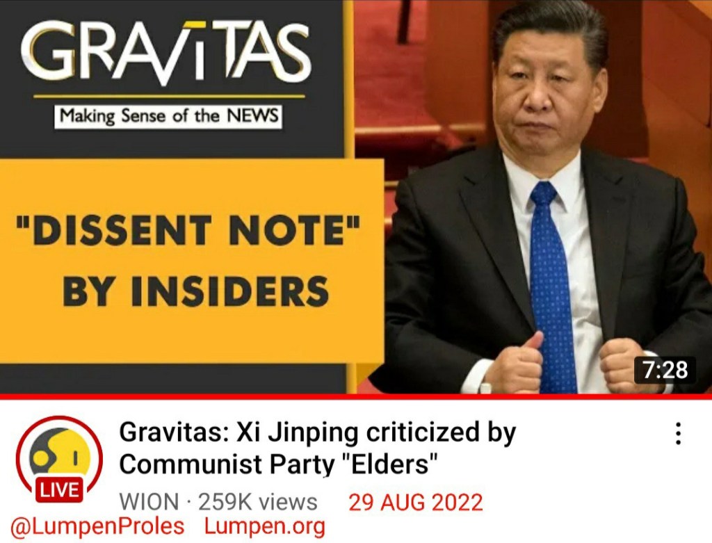 “Gravitas: Xi Jinping criticized by Communist Party “elders”” by WION [via YouTube], 29 AUG 2022.