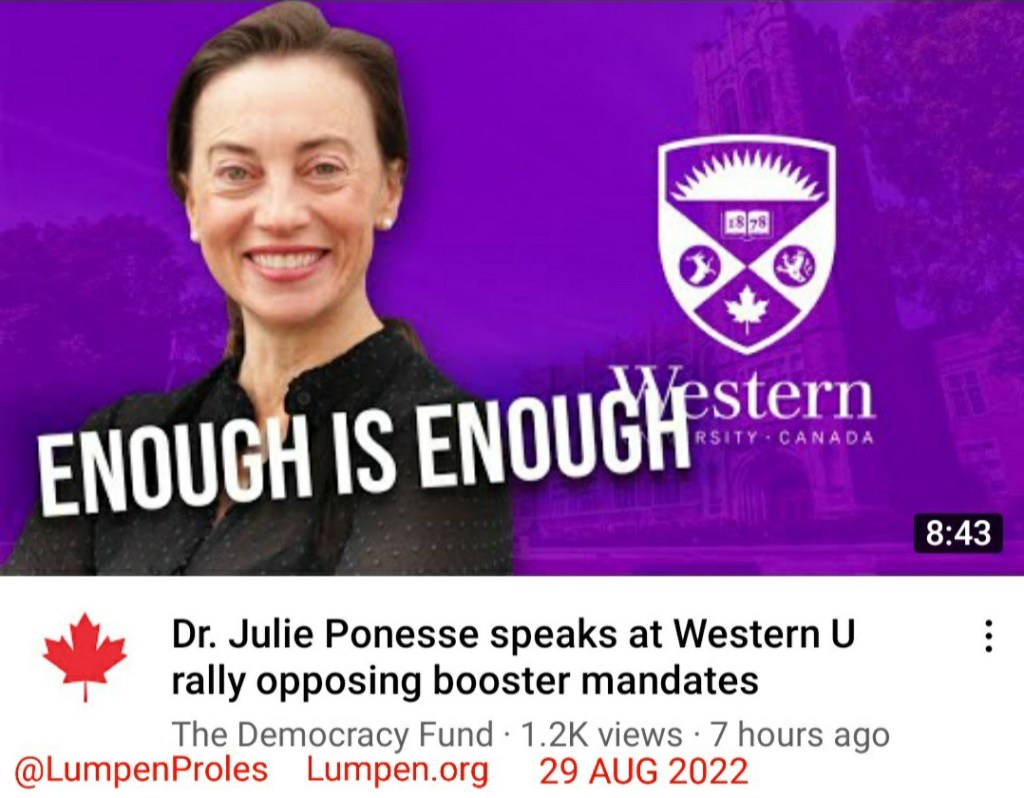 “Dr. Julie Ponesse speaks at Western U rally opposing booster mandates” by The Democracy Fund [via YouTube], 29 AUG 2022.