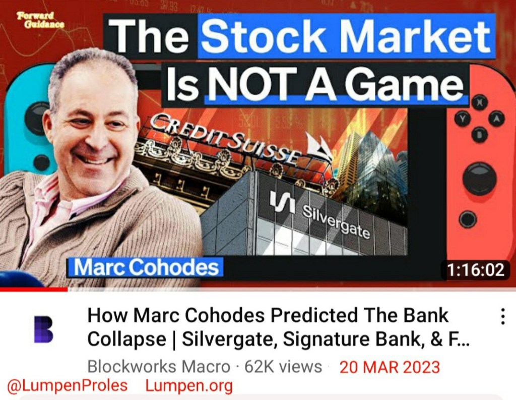 • “How Marc Cohodes Predicted The Bank Collapse | Silvergate, Signature Bank, & FTX” by Blockworks Macro [via YouTube], 20 MAR 2023. [1hr 16min 02sec] (Additional notes on this interview below.)