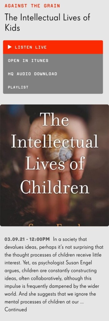 12:00 PST, KPFA > Against the Grain > On The Intellectual Lives of Children > “childhood” […] 1211, speculation is ine of the greatesr gidts of humankind.’ Interesting, and yet, we vilify those who speculate about crime, ie, conspiracy theorist. What’s wrong with this picture? […] kids ask lots of questions, including things which make parents uncomfortable, including sex. But shying away from tough topics can be deleterious to the critical thinking skill of kids. […] ‘It’s not just about letting children play.’ […] 12:44 PST, ‘the social nature of intellectual work is essential.’ […] People who made discoveries, ‘were already gathering bits of information.’ Indeed. Some of us have been trying to find solutions to racism, militarism, and materialism most of our lives.