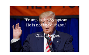 In last night’s speech, portions of which were previously published in printed form (see “Reign of Idiots“, Truthdig, 20 APR 2017), Chris Hedges provided a sincere left critique of our society. And he disabused many liberals of their fixation on President Trump as the bad guy, which conveniently and problematically takes the Democratic Party off the hook for its role in perpetuating the socioeconomic ills of neoliberalism, capitalism, and imperialism. “Trump is the symptom. He is not the disease.”