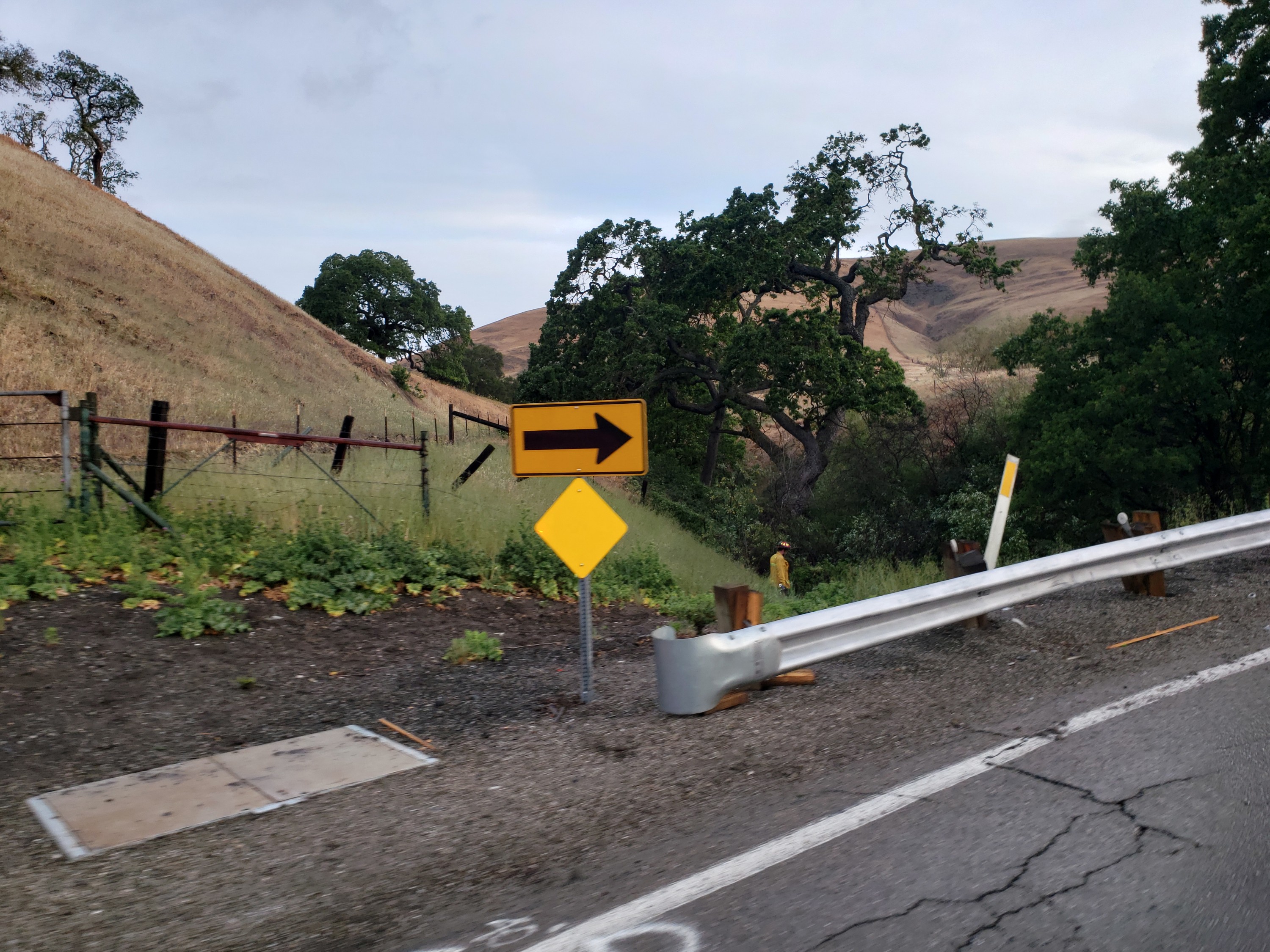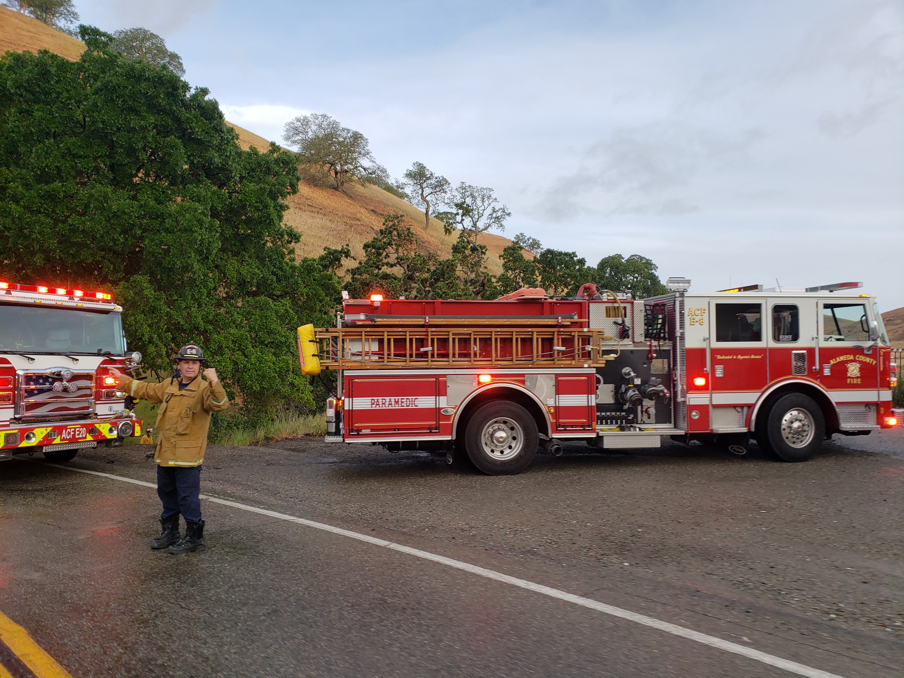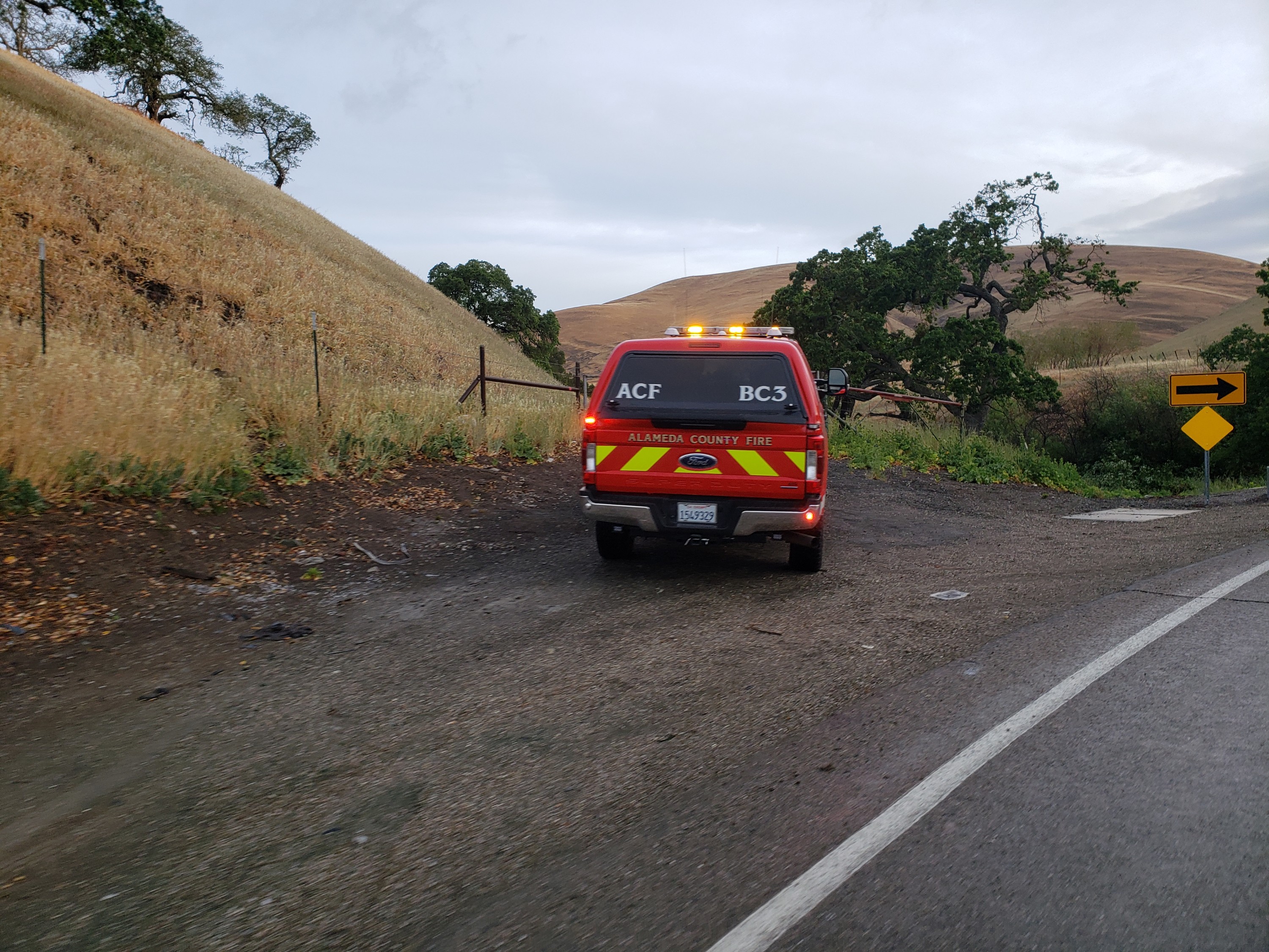 - At approximately 06:55 PDT this morning, Alameda County Fire Department, California Highway Patrol, and paramedics responded to a car, which slid off Tesla Road into a ravine on the Livermore side of the Tesla Road peak at a sharp curve on wet road conditions. It rained in this area last night. The vehicle appears to have been driving westbound, as this is a recurring car crash spot, among others along this working class route of central valley workers to the Bay Area. We hope the driver and any passengers will be alright. Please drive safely, comrades.