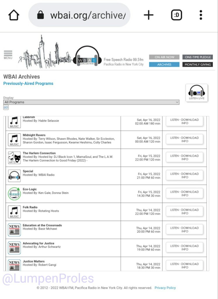 As of 16 APR 2022, WBAI.org archives reflect a gap, which cuts out most of WBAI’s broadcasting from Thursday night to Friday afternoon.