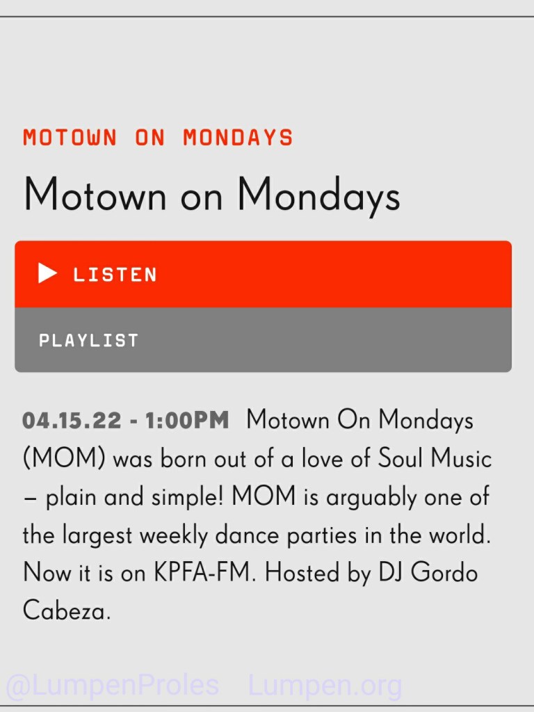 13:00 PDT, KPFA > Project Censored preempted > Motown on Mondays > Music mix.  This sounded like it was a party music mix to celebrate KPFA’s 73rd birthday.  But the website rather creates an impression Project Censored may have been replaced the same way Guns and Butter was replaced by a synthetic left BreadTube version of deep politics.  …   (13:33 PDT) [CC]